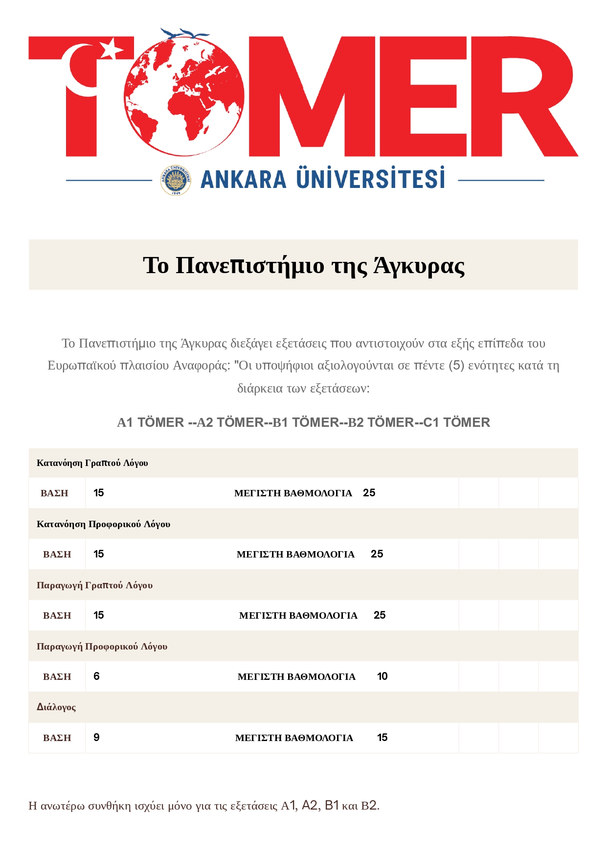 Το Πανεπιστήμιο της Άγκυρας διεξάγει εξετάσεις που αντιστοιχούν στα εξής επίπεδα του Ευρωπαϊκού πλαισίου Αναφοράς: “Οι υποψήφιοι αξιολογούνται σε πέντε (5) ενότητες κατά τη διάρκεια των εξετάσεων:
