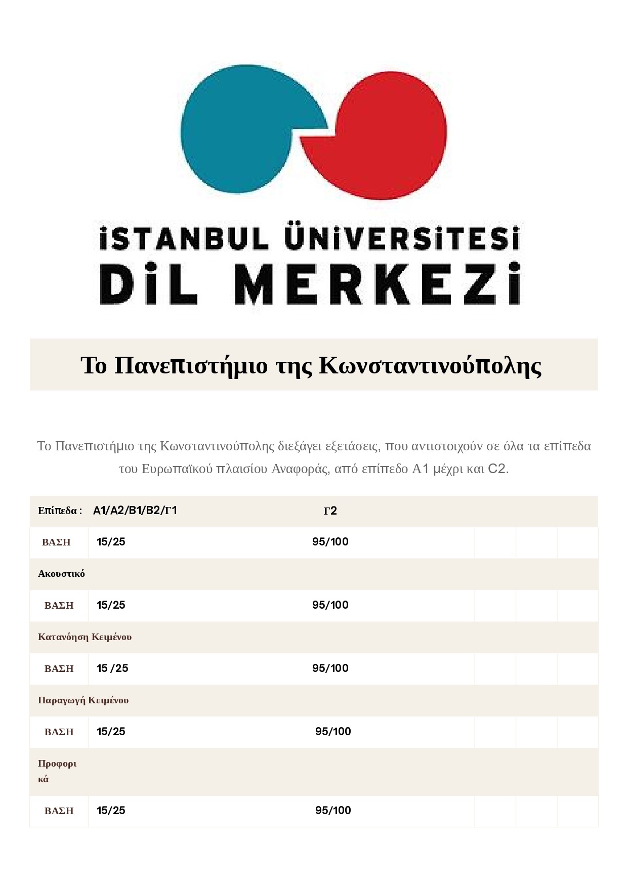 Το Πανεπιστήμιο της Κωνσταντινούπολης διεξάγει εξετάσεις, που αντιστοιχούν σε όλα τα επίπεδα του Ευρωπαϊκού πλαισίου Αναφοράς, από επίπεδο Α1 μέχρι και C2.