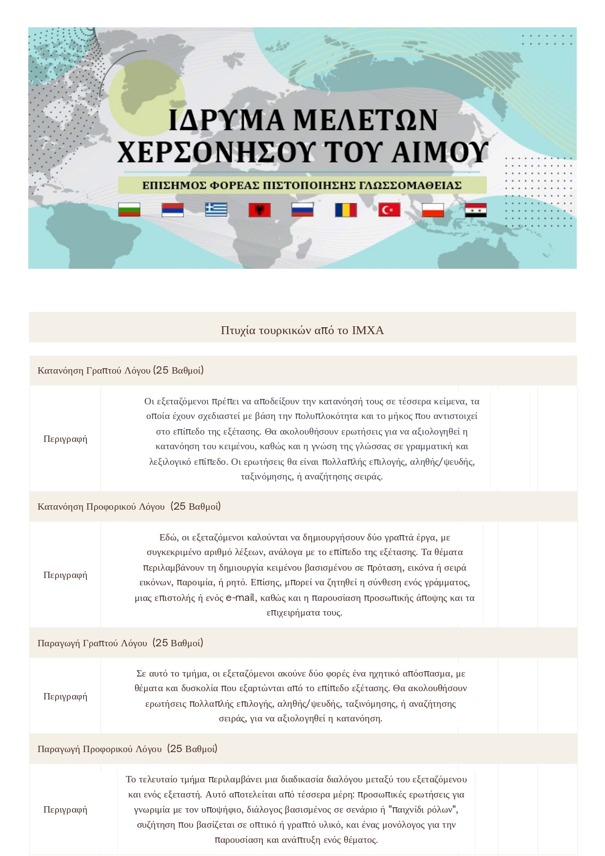 Tο Ίδρυμα Μελετών Χερσονήσου του Αίμου (ΙΜΧΑ). Οι εξετάσεις καλύπτουν όλα τα επίπεδα του Ευρωπαϊκού Πλαισίου Αναφοράς (CEFR), από το επίπεδο A1 έως το C2.